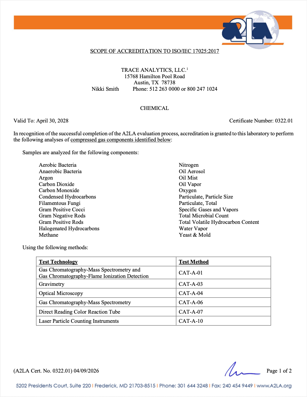 Certificado de acreditação A2LA da Trace Analytics