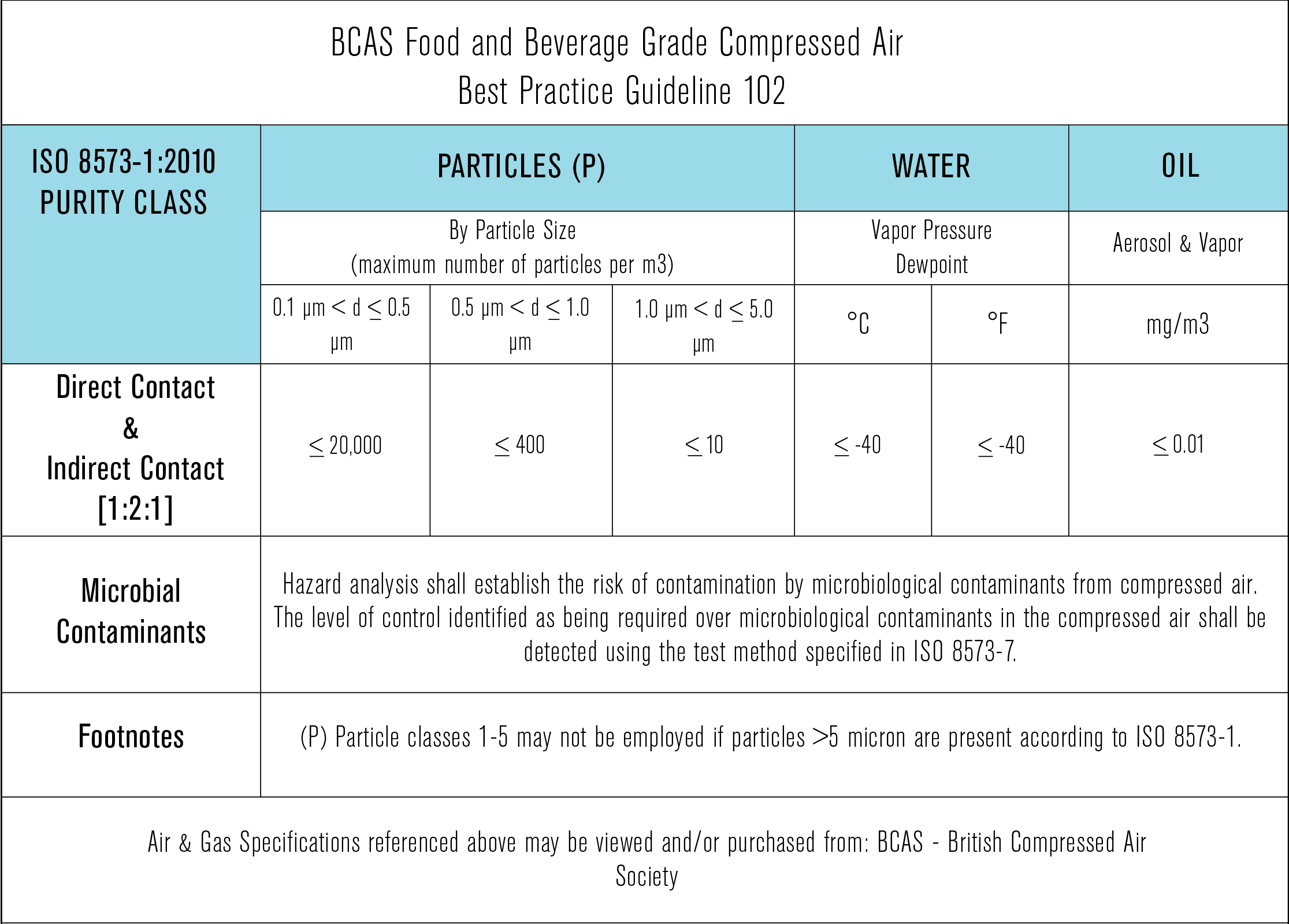 The British Compressed Air Society (BCAS) Food and Beverage Grade Compressed Air Best Practice Guideline 102 is an excellent reference for the food manufacturer and its suppliers. The BCAS Best Practice Guideline identifies the four primary areas of potential contamination in compressed air – Particles, Water, Oil, and Microbiological Contaminants. Section 7 of the Guideline states that compressed air coming in Direct or Indirect Contact with food shall meet ISO 8573-1:2010 Purity Class 1:2:1. See Table below for limits.